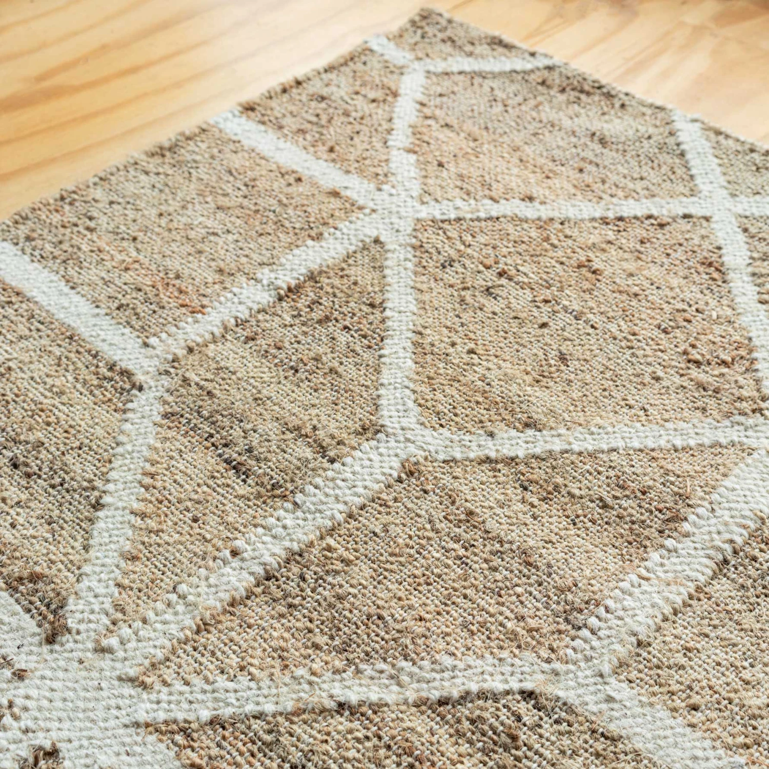 Jute Fretwork – A honey coloured rug with a beautiful white geo fretwork design all over giving a lift on our natural collection.
