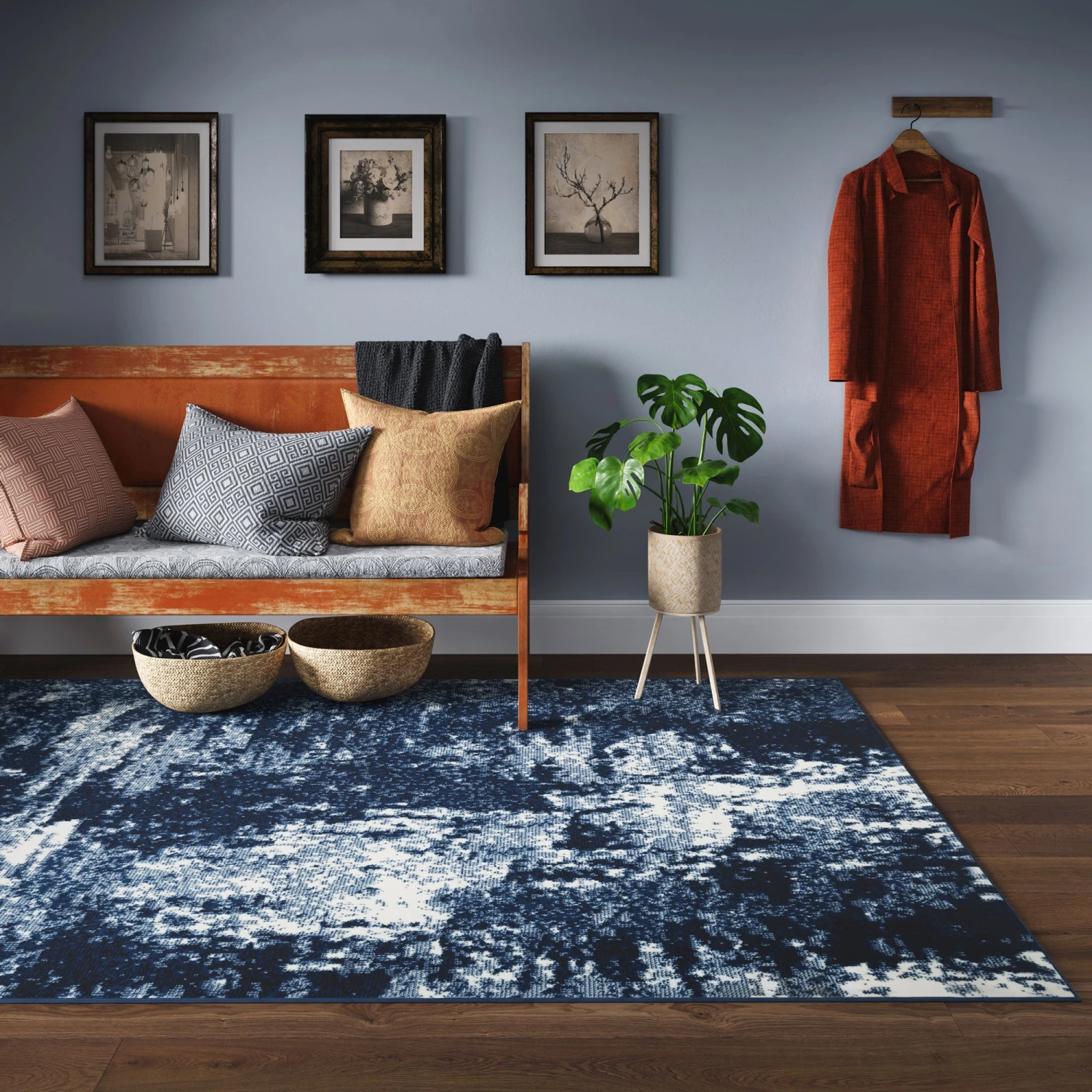 Lose yourself in the artistic blend of blue and navy tones that evoke the depths of the ocean. This rug not only brings a sense of intrigue and fascination but also embraces the on-trend distressed pattern, adding a touch of vintage charm and character to your space.