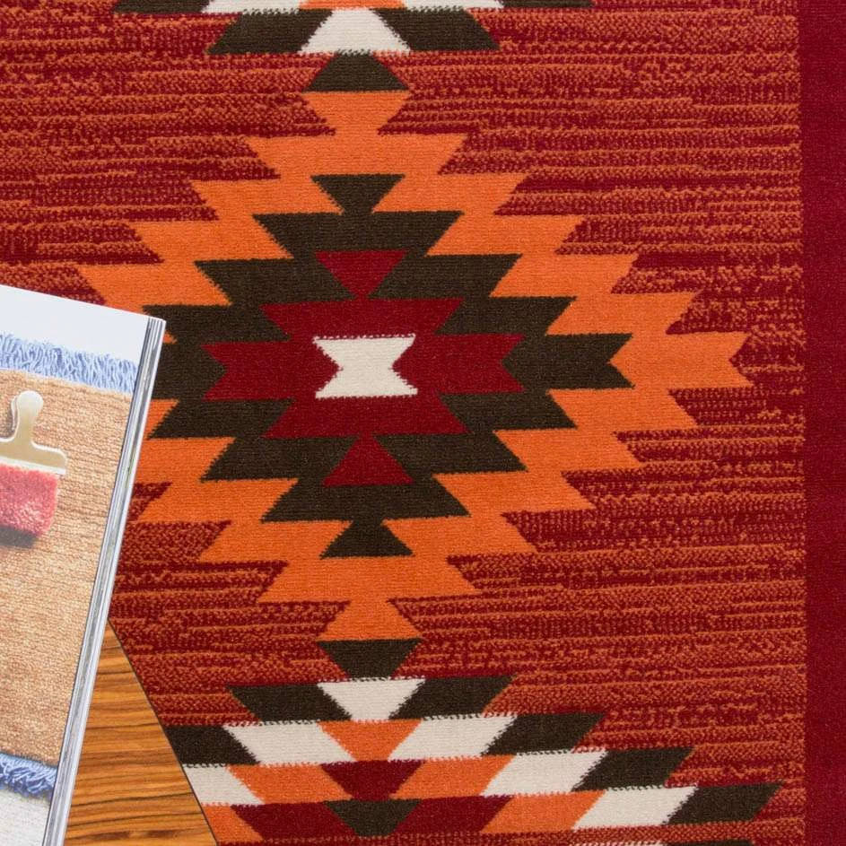 Inspired by the beautiful tribal trends, this Aztec styled rug incorporates vibrant red, orange, white and brown colours in a diamond design. This Milan rug offers a bold motif and will enhance your room through the traditional design.