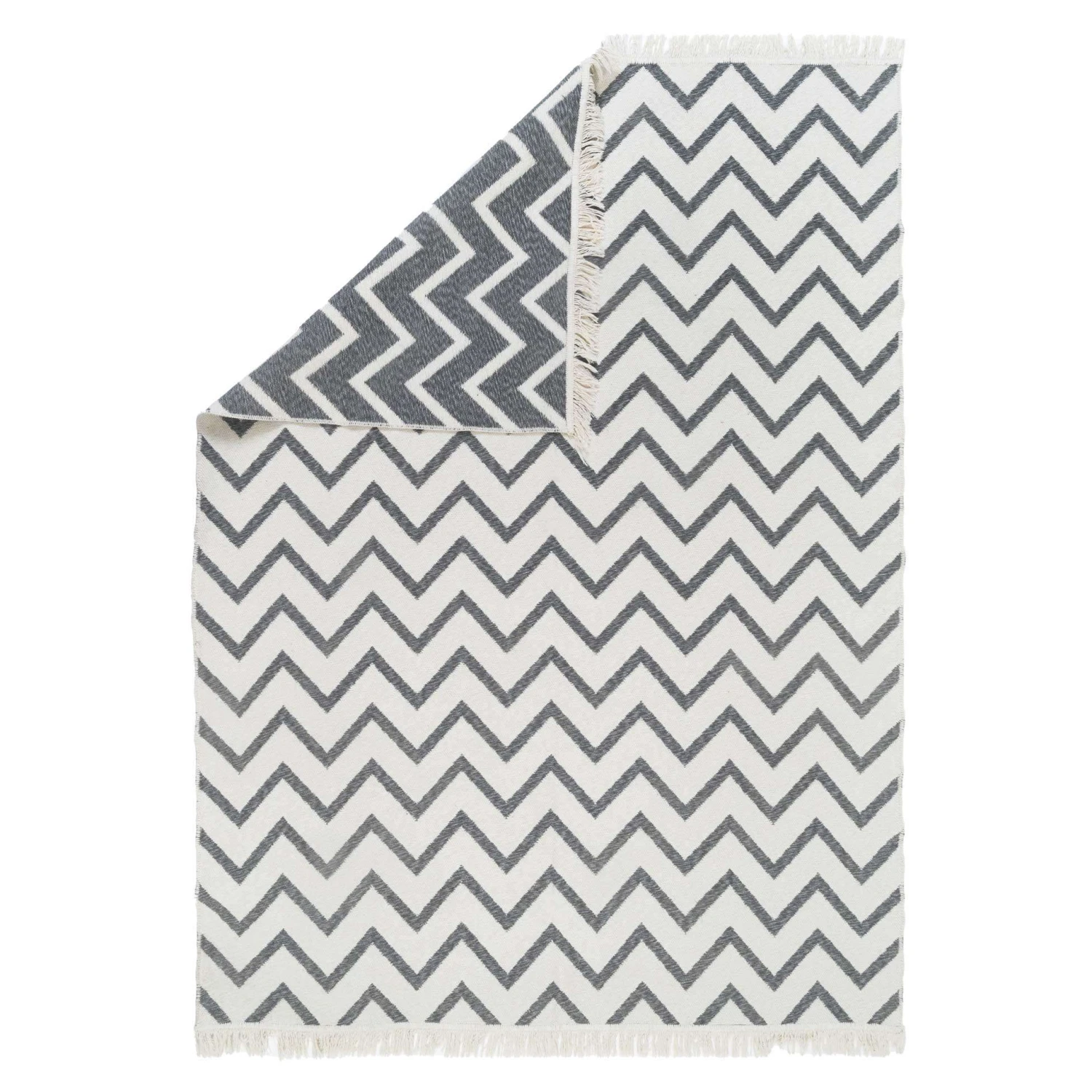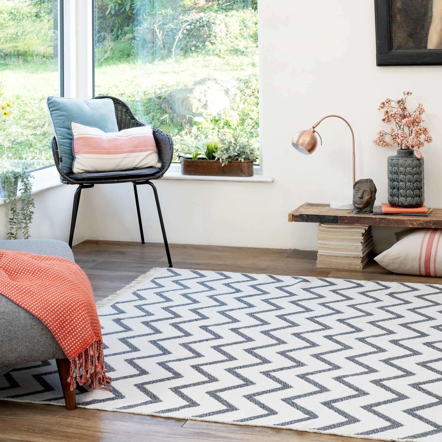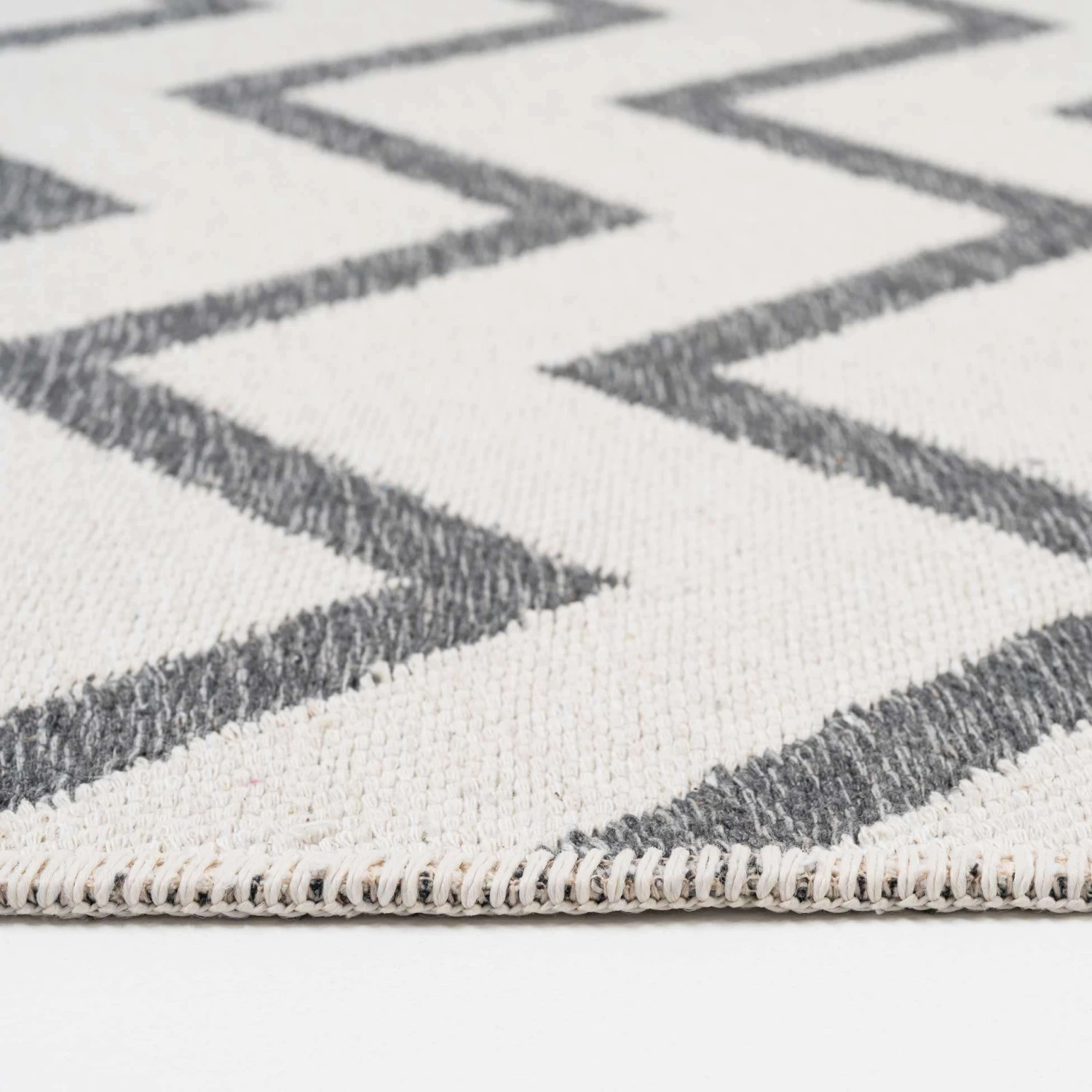 Hilly Charcoal: A bold, exciting design, using a weaving chevron pattern, grounded in dark grey and cream.
