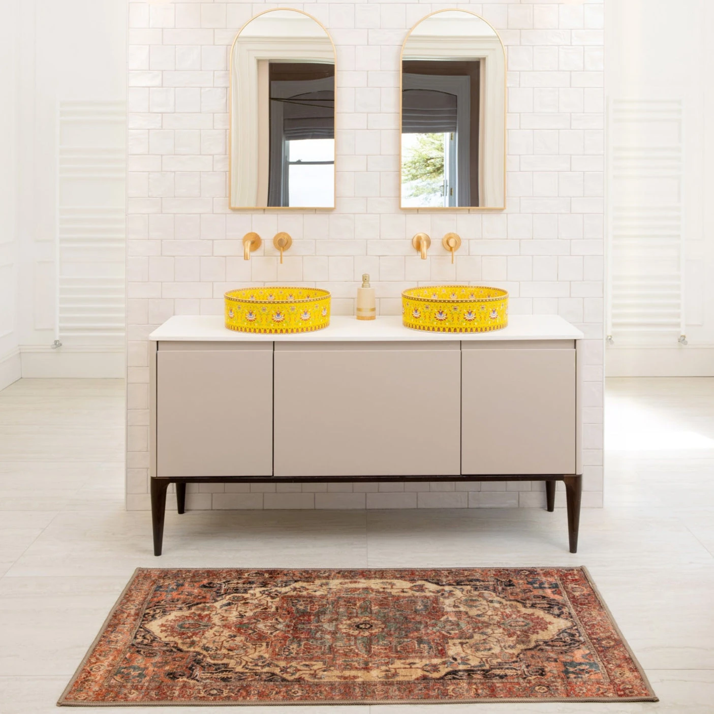 Verity means ‘truth’ a name that reflects her open, effortless beauty. Inspired by traditional Kashan Persian rugs, her intricate medallion design unfolds in rich navy blues and warm terracotta, blending heritage with a sense of style and character to your bathroom.