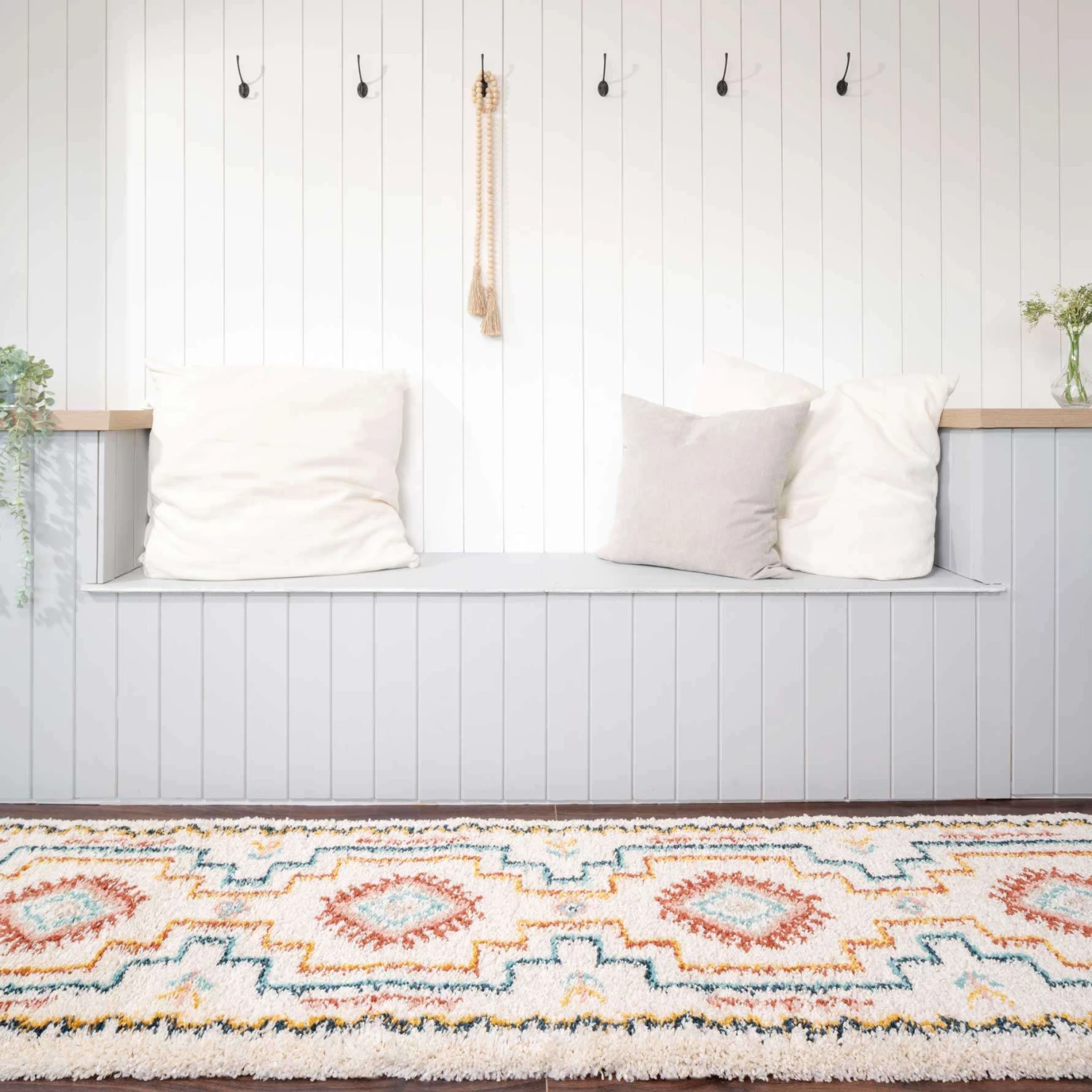 Mallory Multi: A cream oatmeal ground plays host for this simple tribal diamond motif. Full of colour and vibrancy, Mallory is a firm favourite with our design team.